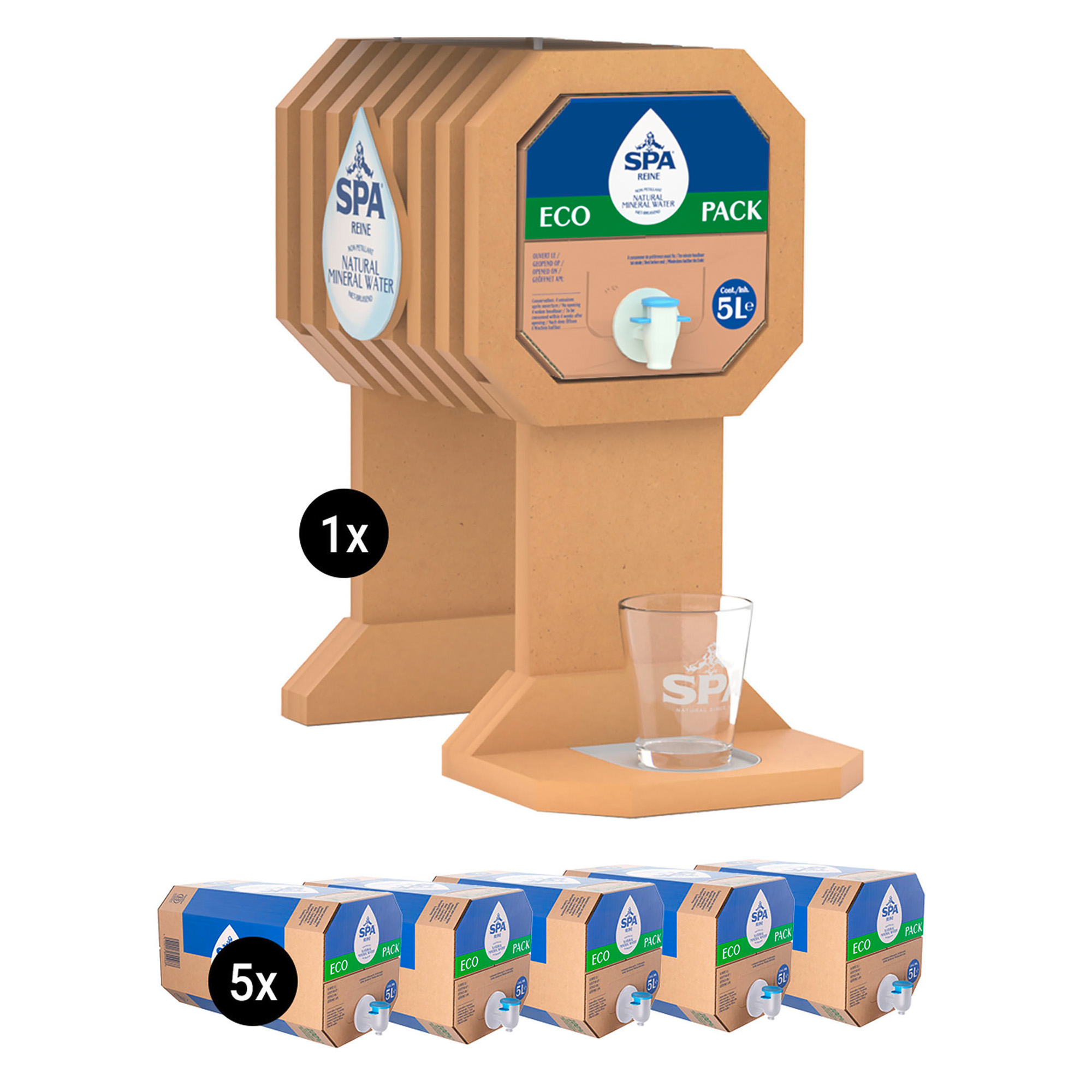 Deze actie bestaat uit 5 Ecopacks Spa Reine van 5 L + 1 gratis verdeler.