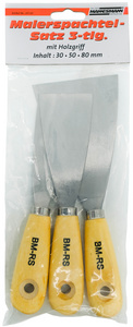 ProductinformatieRoestvrijstalen mes, mesbreedte: 30/50/80 mm,met houten handvat,inhoud: 3 plamuurmessen.