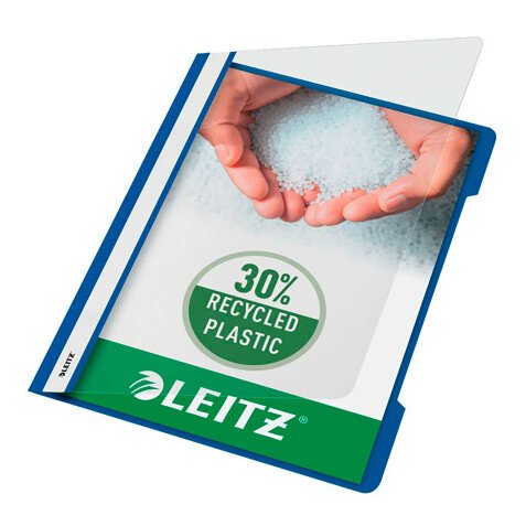 Leitz standaard plastic blauwe offertemap, 30% pre-consumer gerecycled plastic. Mappen van topkwaliteit, gemaakt van 30% pre-consumer gerecycled plastic voor een betere bescherming van de inhoud Gemaakt van 30% pre-consumer gerecycled PP plastic 100% recyclebaar (metalen mechanisme moet van het plastic worden gescheiden) Hoogwaardige materialen zorgen voor een product dat lang meegaat en helpen de grondstoffen van de aarde te sparen Glasheldere omslag toont eerste pagina van document Titelstrook over de volledige lengte, met uitsnijding aan de boven- en onderkant voor makkelijke verwijdering Uitsparing aan de achterkant voor gemakkelijk openen Capaciteit 60 x A4 (80 grams papier) Alleen etiket - geen verder verpakkingsafval.