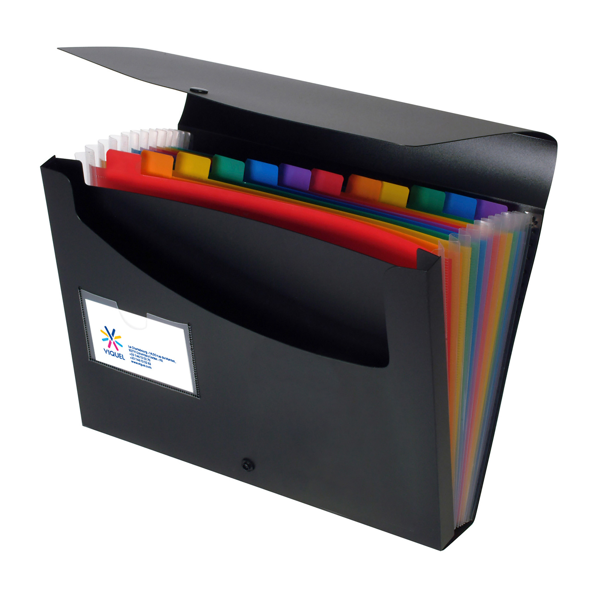 De uitschuifbare map met 12 tabs Viquel Rainbow Class is gemaakt van 7/10 polypropyleen met een zwarte buitenkant en een veelkleurige binnenkant