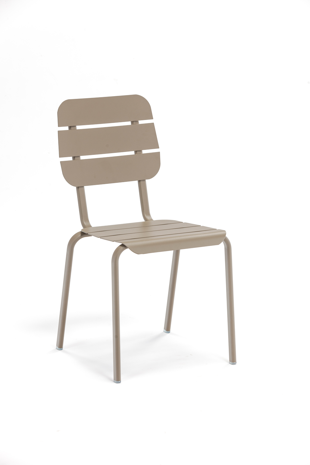 Arnon stoel in aluminium, een elegant product met trendy kleuren. Volledig gemaakt van aluminium, poedercoating in mokka, groen of waterblauw, licht en resistent. Stapelbaar voor gemakkelijk opbergen. Kan gecombineerd worden met de tafels Arnon of Layon.