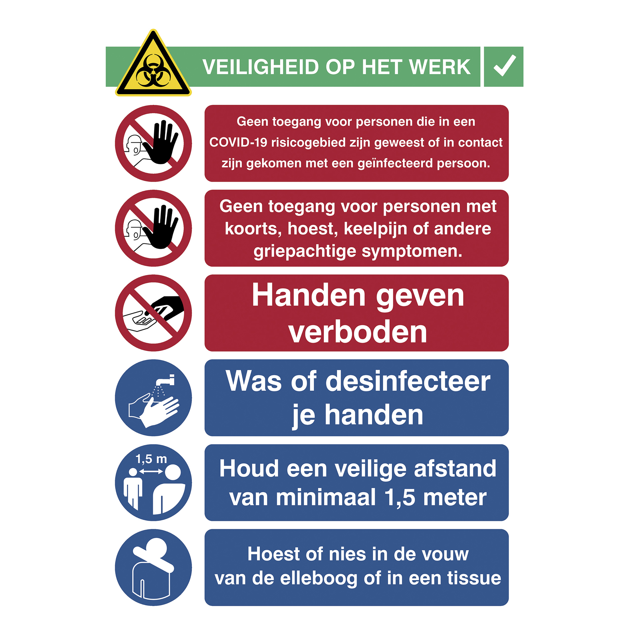 Zelfklevende sticker in A3 formaat met richtlijnen voor veiligheid op het werk. Prijs per stuk.