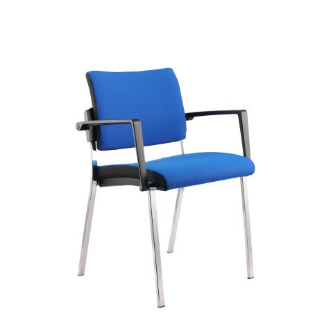 Vergaderstoel op 4 poten met armleuningen. Rechthoekige, verchroomde structuur 25 x 15 mm. Met kleine onderlegplaatjes in zwarte plastic onderaan de voetjes als bescherming. Armleuningen in zwart polypropyleen, niet afschroefbaar. Rugleuning met bekleding in zwarte plastic. Moderne bekleding in 2 kleuren met een zichtbaar stiksel. Stapelbaar per 4. Met beschermsysteem voor stapeling. Draagvermogen: 120 kg. Gewicht: 10 kg. Breedte van de stoel: 46 cm. Afmetingen zitting: H 45 x D 47 cm. Hoogte armleuningen: 66 cm.