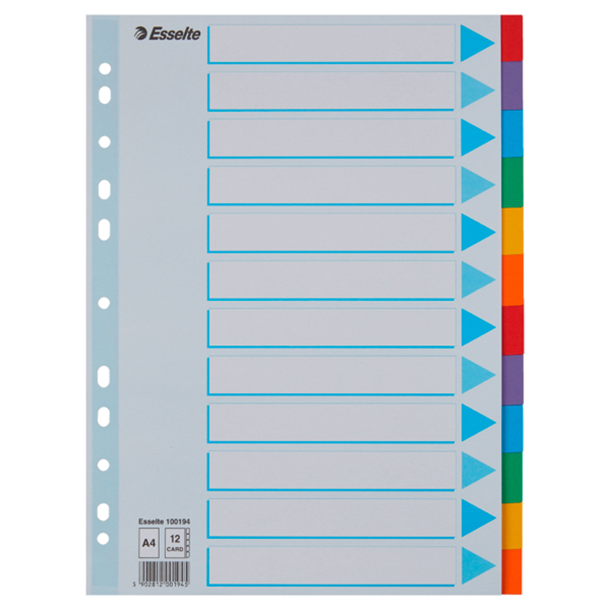 De A4-gekleurde kaartindexen van Esselte met 12 tabs hebben een combinatie van felle kleuren. De voorpagina heeft een grote sectie voor de beschrijving.