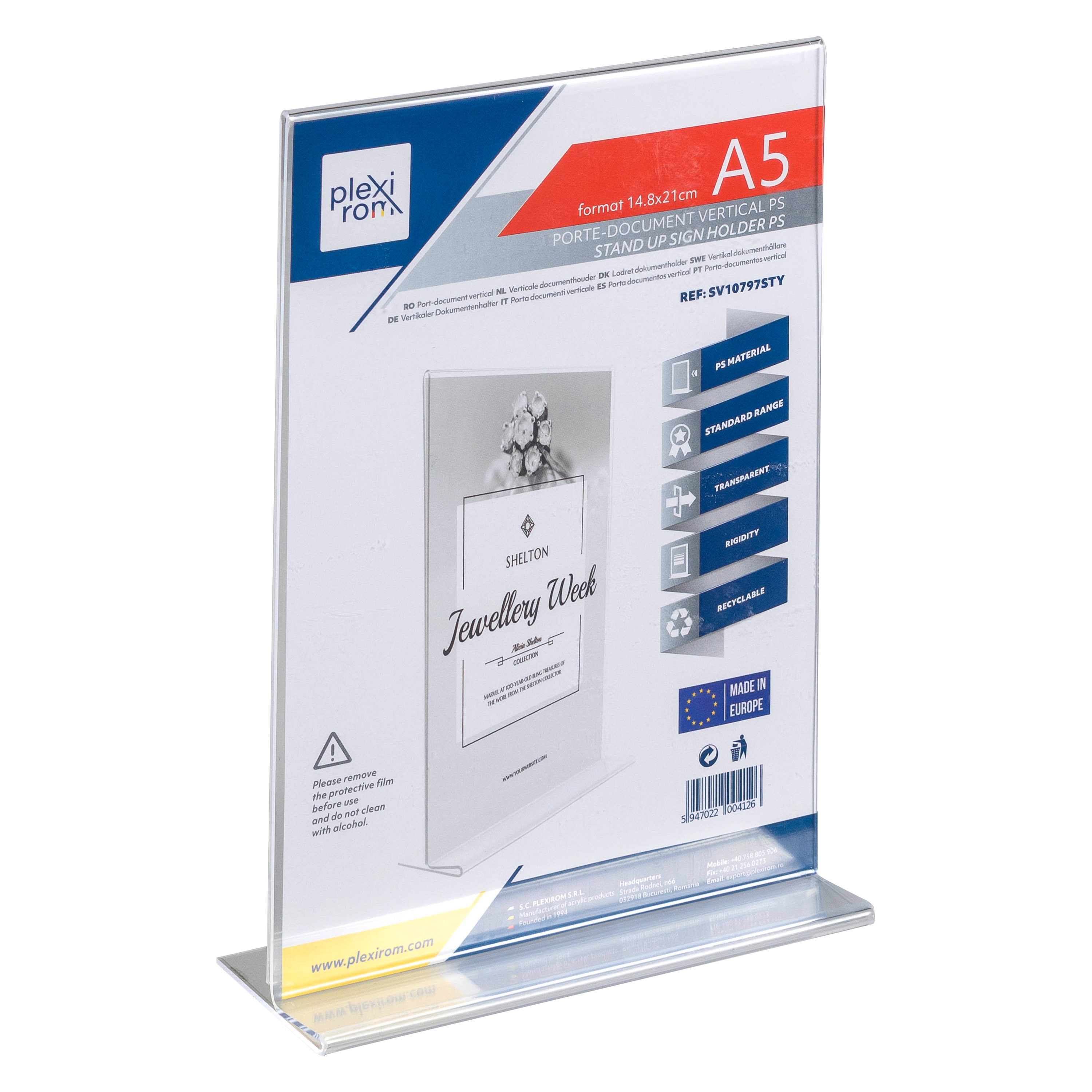 ProductinformatieWilt u uw belangrijke informatie benadrukken door deze maximaal zichtbaar te maken? De dubbelzijdige tafeldisplay is het ideale antwoord dankzij zijn dubbelzijdige weergave en grote transparantie.Op een elegante en praktische manier zullen uw documenten, flyers of menu's in A5-formaat goed zichtbaar zijn.Bovendien plaatst u ze gemakkelijk aan de zijkant.Zijn stevige polyethyleen constructie garandeert de weerstand en kwaliteit van deze display.De brede en stabiele basis zorgt voor een optimale ondersteuning van uw display.Afmetingen van deze display: H 21,5 x B 15 x D 8,4 cm.