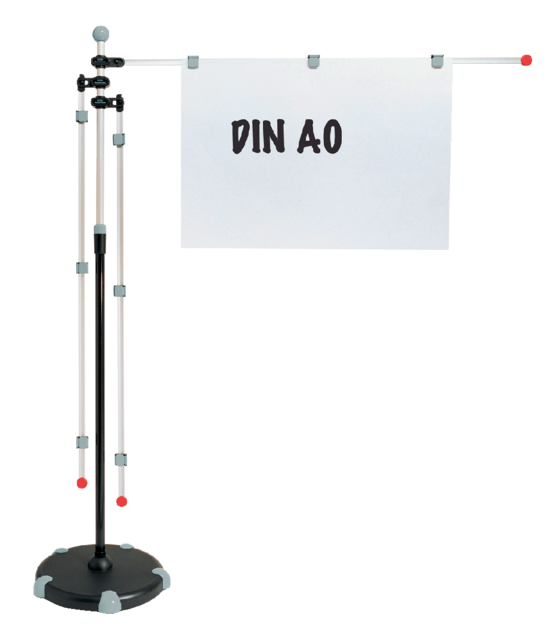 * Telescopisch aluminium statief, instelbaar van 140 - 200 cm hoogte met mobiele voet. * 3 Aluminium zwenkarmen A0 (132cm) met elk 3 verschuifbare magneetclips. * Arm met geïntegreerde rem om hoogte naar wens in te stellen, met schuifbare magneetclips voor de documenten, die aan beide kanten kunnen worden gehangen. * Indien buiten gebruik kunnen de armen, plaats besparend, ingeklapt worden. * Gewicht van de voet is 6,9 kg. * Zeer functioneel - attractieve vormgeving.