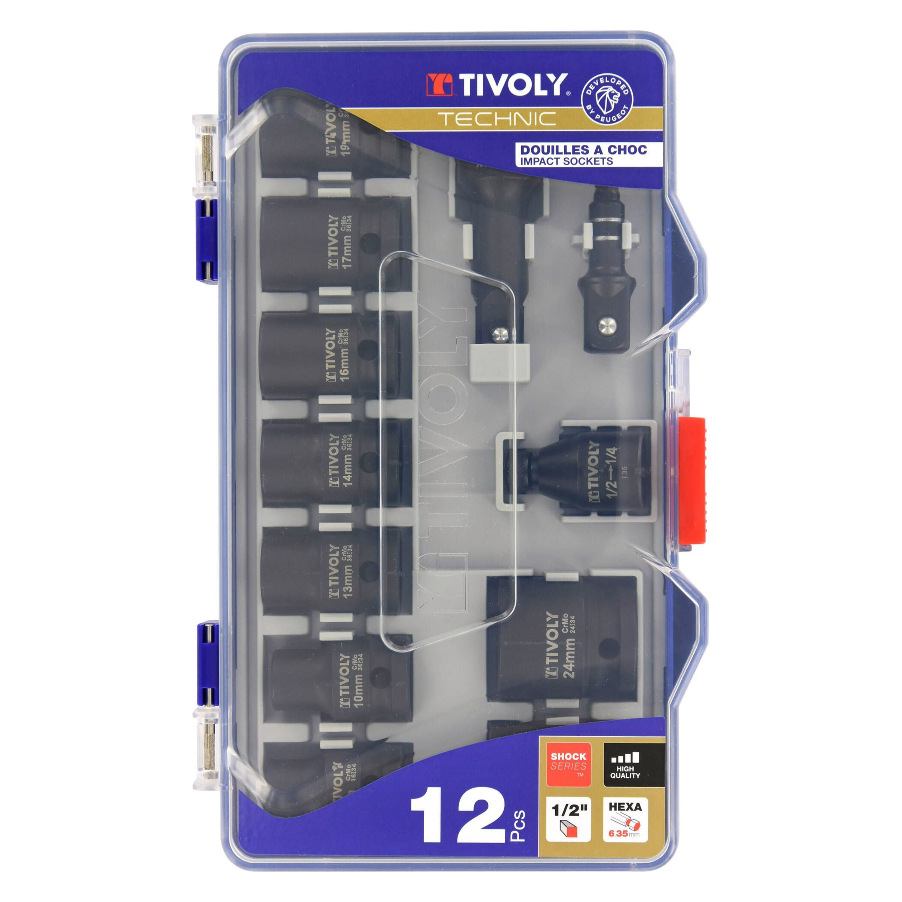 9 impactdopsleutels 8- 10- 13- 14- 16- 17- 19- 21- 24mm + 1 adapter voor F 1/2" met zeskantschacht van 6.35 mm + 1 verlengstuk van F 1/2" naar M 1/2 L75mm + 1 houder voor zeskantdopsleutels van 6.35 mm voor 1/2" dopsleutels Chroom Molybdeen Cr-Mo staal