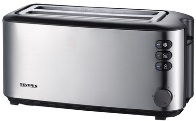 Kies voor de Severin AT 2509 4-sneden broodrooster, een krachtig en elegant apparaat om een smakelijk ontbijt eenvoudig voor te bereiden. Met zijn moderne design in roestvrij staal en zwart past deze broodrooster perfect in uw professionele keuken.