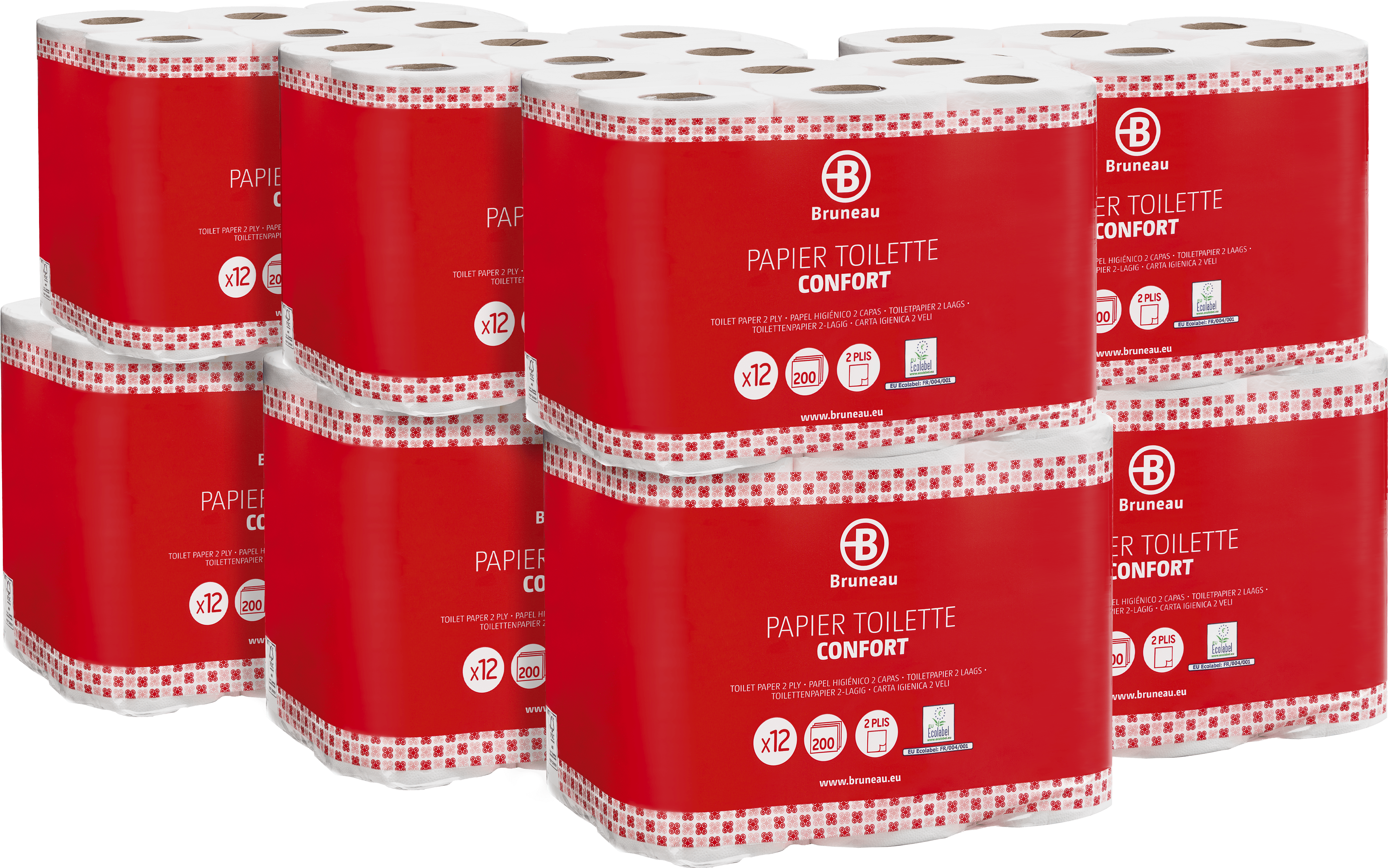Handig en voordelig, een pakket toiletpapier van Bruneau bestaat uit 96 rollen.