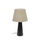 Tafellamp van zwart gelakt metaal en een linnen kapje.