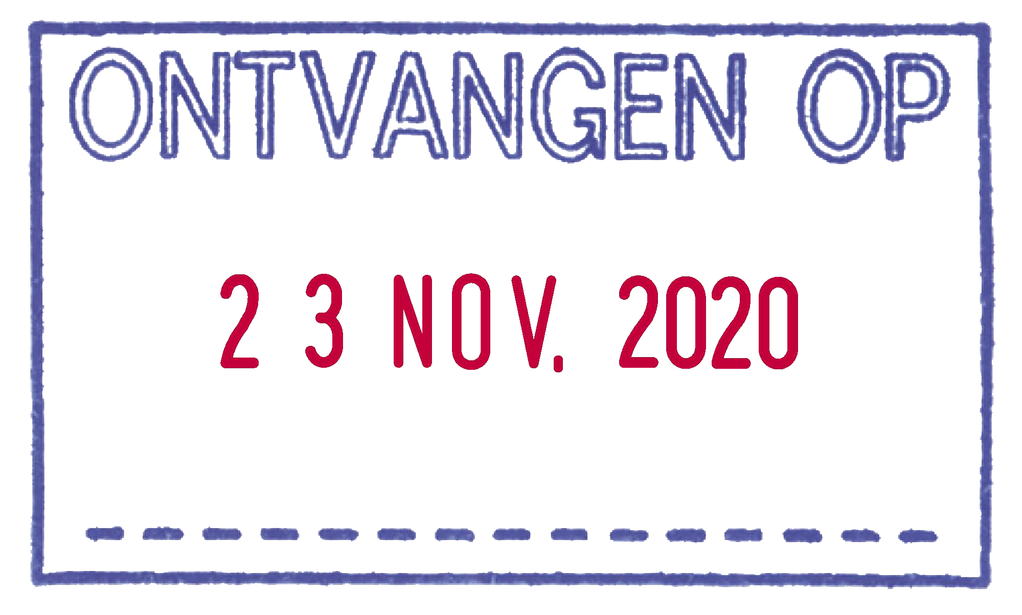 ProductinformatieAfdrukgrootte: 39,5 x 23 mm, vaste tekst "ONTVANGEN OP", datum Nederlands 23 NOV. 2020, schrifthoogte datum: 4 mm.