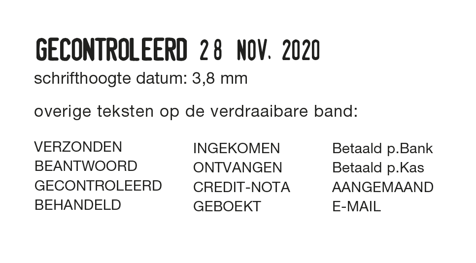 Datumstempel met Nederlandse formules. Teksten: VERZONDEN, BEANTWOORD, GECONTROLEERD, BEHANDELD, INGEKOMEN, ONTVANGEN, CREDIT-NOTA, GEBOEKT, BETAALD PER GIRO, BETAALD p. BANK, BETAALD p. KAS, AANGEMAAND, E-MAIL. Schrifthoogte datum: 3,8 mm. Inktkleur: zwart.