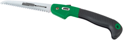 ProductinformatieInklapbare zaag, ergonomische handgreep, zaagblad van gehard gereedschapsstaal, geslepen en geharde tanden, met veiligheidsknop, gewicht: 195 g, kleur: zwart/groen, in blisterverpakking.
