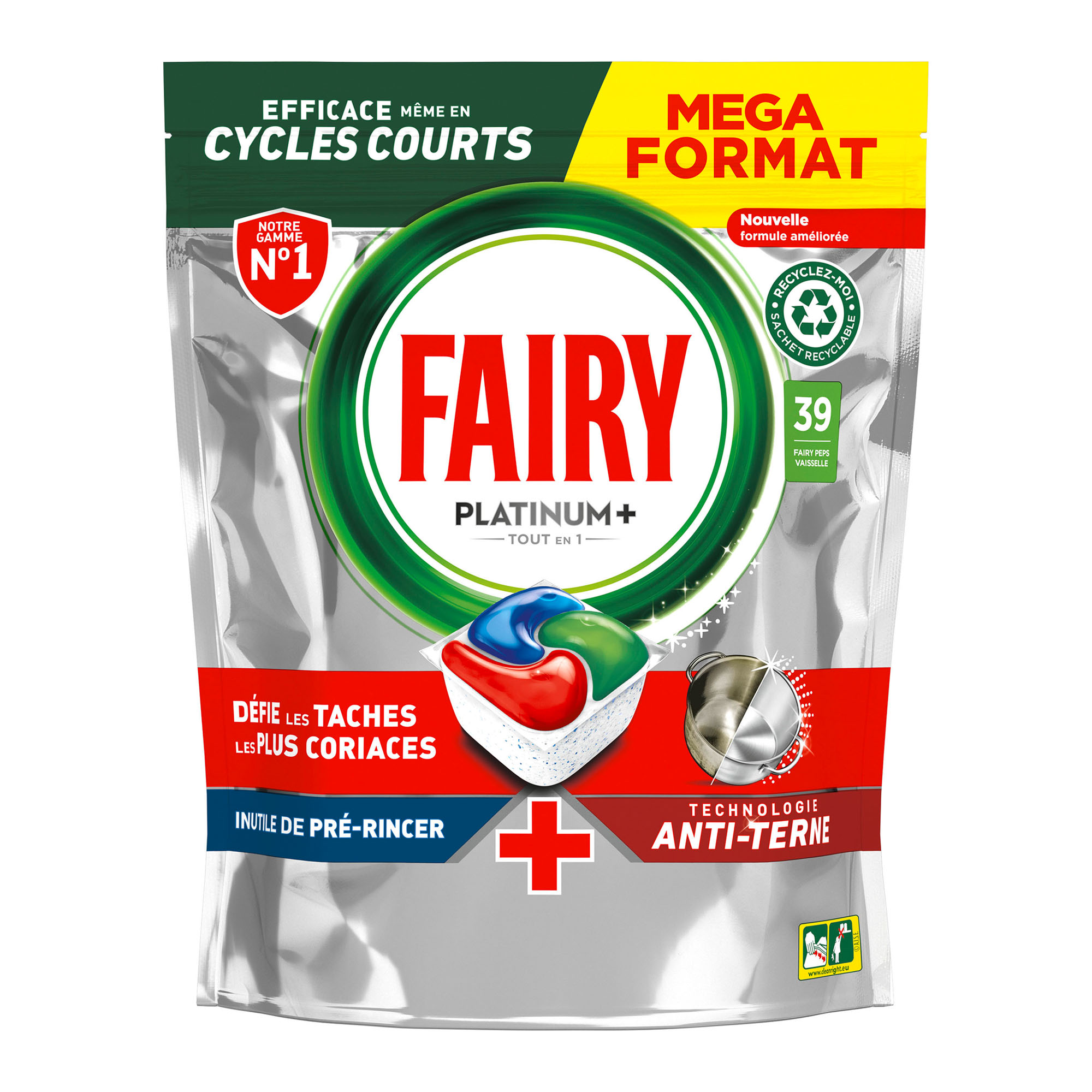 • Fairy Platinum Plus zorgt voor een uitzonderlijke reiniging die hardnekkige vlekken uit extreem vuile vaat verwijdert zonder voorspoelen.