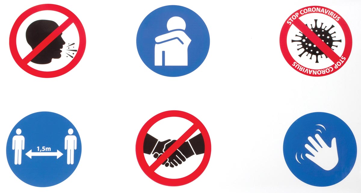 Sticker met 6 symbolen voor veiligheid en hygiënevoorschriften. Ft 100 x 50 cm.