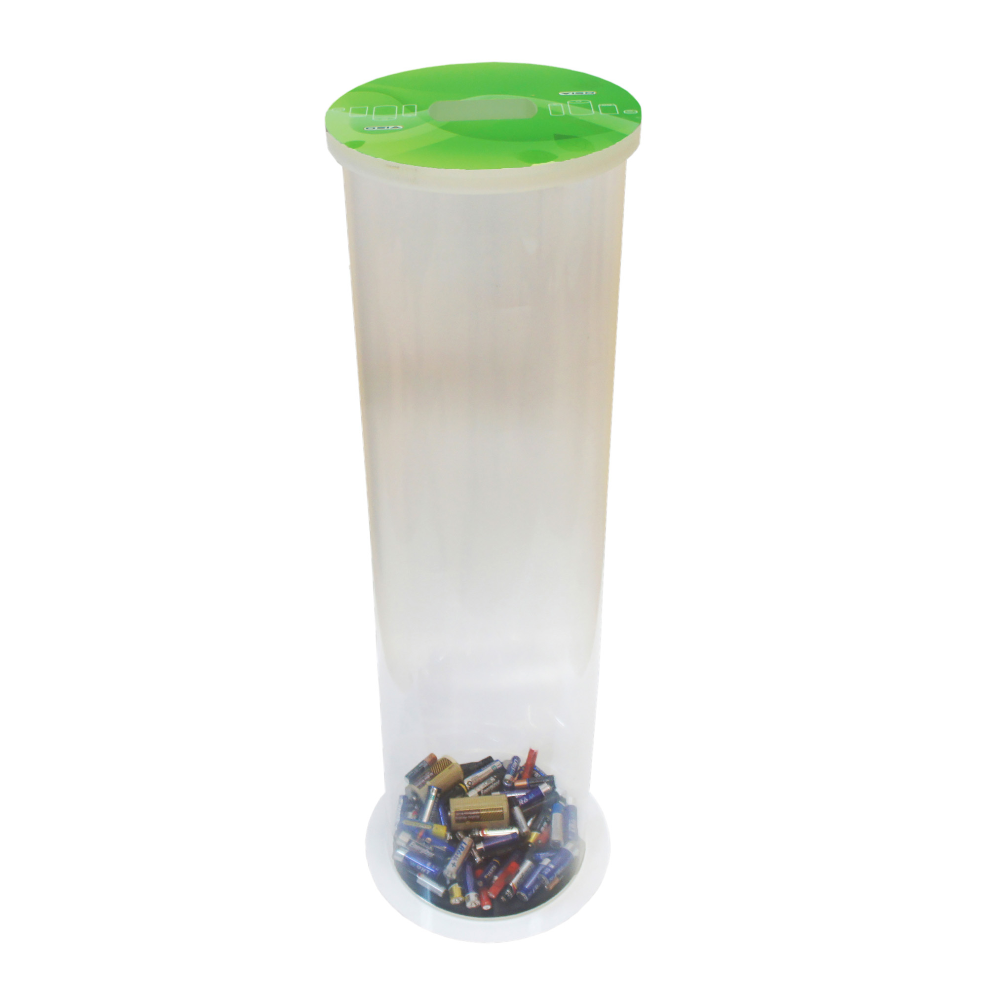 Transparant plastiek, 2 modellen : Kolom : H 75 x diameter 25 cm. Verwijderbaar deksel met gleuf van 8,8 x 5 cm voor het ingooien van de batterijen. Onderaan laag in schuim zodat het geluid bij de val van de batterijen gedempt wordt. Toonbankmodel : H 17,5 x diameter 19 cm. Deksel met gleuf van 3 x 8 cm.