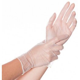 Wit, vinyl, niet gepoederd, lengte : 240 mm, voor personen allergisch aan latex. Geschikt voor contact met voedingswaren, scheuren niet, zeer elastisch, wit doorzichtig vinyl met gerolde bord, , hoge tactiele gevoeligheid, niet geschikt voor contact met niet vette voedingswaren. Inhoud : 100 stuks in doos met voorgesneden opening