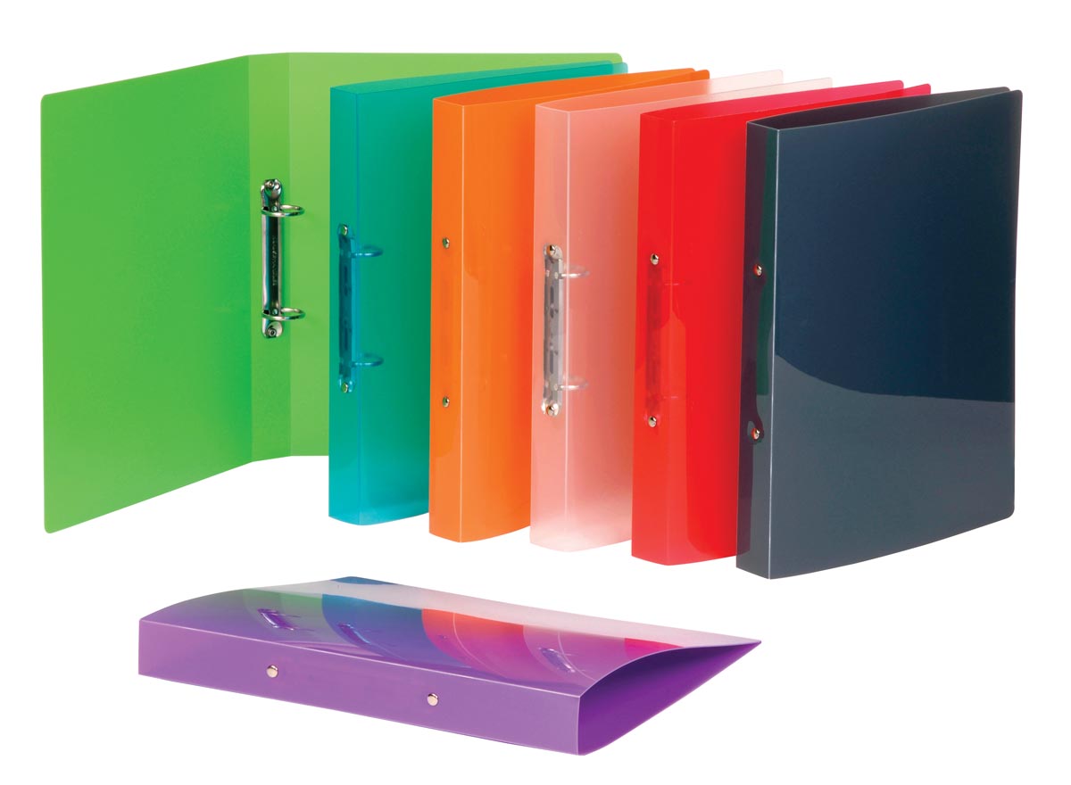 ProductinformatieVoor ft A4. Uit PP. Met 2 ringen van 30 mm. Geassorteerde transparante kleuren: kristal, rood, groen, blauw, oranje, paars en antraciet.