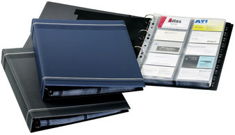 Antraciet, met 20 transparante vakken, twee rijen, A-Z map met 12 tabs, voor 400 visitekaartjes 57 x 90 mm, mechanisch met 4 zilveren ringen, hard mat kunststof, afmetingen: (L)265 x (D)38 x (H)315 mm.