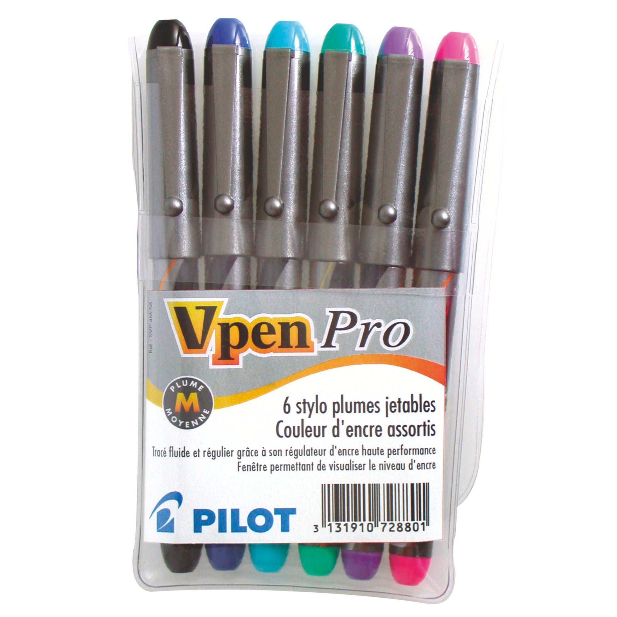Stalen vulpen. Vloeibare inkt. Ronde plastic behuizing. Zichtbaar inktniveau. Dopje. Plastic clip. Lijnbreedte 0,5 mm. 1) etui met 6 design (zilveren behuizing) : zwart-blauw-paars-roze-groen-turkoois 2) etui met 6 klassiek (witte behuizing).zwart-blauw-turkoois-paars-roze-groen Inktstylo.,balpen vloeibare inkt,schreifgerei
