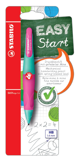 STABILO Easyergo 1.4. Met potloodstift van 1.4mm Voor de gevorderde schrijvers, vanaf ongeveer 7 jaar Vulpotlood met meeverende schrijfpunt Onderdeel van de STABILO Easystart lijn Innovatieve en ergonomische vormgeving - speciaal ontwikkeld voor de kinderhand Verkrijgbaar in links- en rechtshandige uitvoering Gripzone van anti-slip materiaal, bevat geen latex Dunne potloodkern (1,4mm), slijpen niet nodig Voor precies schrijven tussen smalle lijnen of op gelinieerd papier Trendy kleurencombinaties en ruimte voor de naam Ontspannen ligging in de hand zorgt voor vloeiend en moeiteloos schrijven, zonder kramp te krijgen.