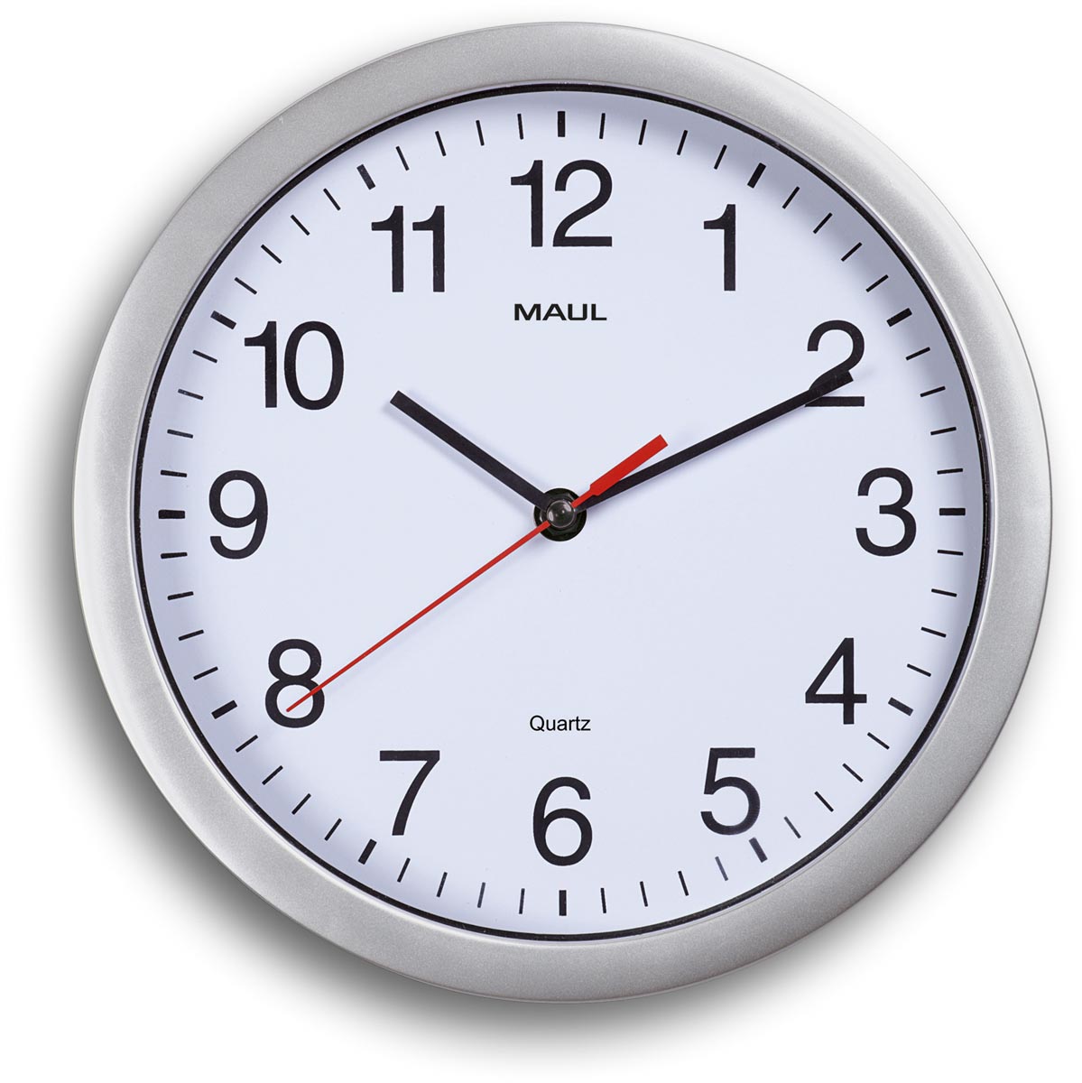 * Wandklok met Quartz uurwerk, instap model voor prijsbewuste consumenten. * Voorzien van een Duits quartz uurwerk. * Doorsnede 25,2 cm. * Moderne, elegante uitstraling voor in kantoor of bij u thuis. * Zilverkleurige rand van hoogwaardig kunststof. * Witte wijzerplaat, in zwart bedrukt met Arabische cijfers, cijferhoogte 23 mm, inclusief uur- en minuut aanduiding. * De klok is goed af te lezen, ook vanaf een grotere afstand. * Deze wandklok van Maul is voorzien van een geluidloos draaiend uurwerk. * Wandklok afgewerkt met mineraalglas voor de wijzerplaat. * Dit model 9052695 is uitgevoerd als Quartz klok, deze zijn functioneel in gebouwen waar het radiosignaal lastig of niet te ontvangen is, uiteraard moet deze klok handmatig op de juiste tijd ingesteld worden. Bijkomend voordeel van een Quartz klok is dat de wijzers (klok) stildraaiend is.* Werkt op één 1,5 V AA batterij, deze is bijgesloten. * Eenvoudige montage d.m.v. ophangoog. * Te gebruiken in kantoren, spreek- en wachtkamers, ontvangsthallen, werkplaatsen of thuis. * Wijzer draait vloeiend.