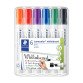 ProductinformatieLijnbreedte: 2,0 - 5,0 mm, schuine punt,navulbaar, DRY SAFE, droog uitwisbaar, vaste tip,diverse kleuren: zwart, blauw, rood, groen, oranje en paars,inhoud: 6 stuks,witte behuizing/ tip en dop in de kleur van de inkt,in een STAEDTLER-etui.