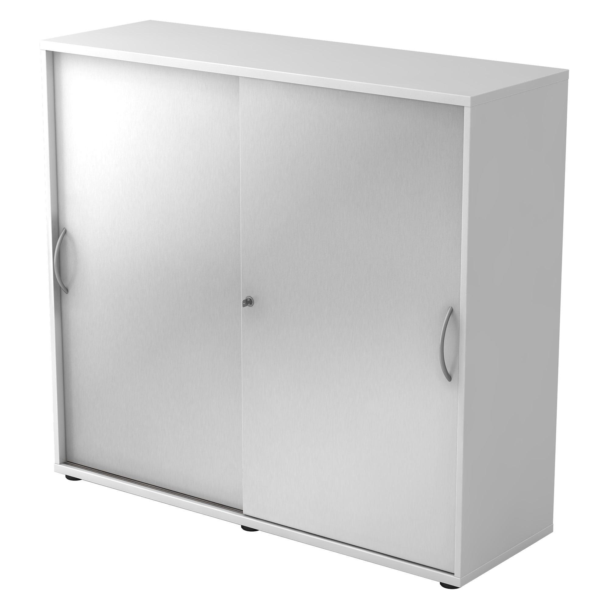 Structuur : spaanplaat bekleed met melaminelaag (DIN 68765 - Klasse E1). Voorzijde met 2 mm dikke beschermstrook in ABS, afgerond. Dikte zijkant: 16 mm, dikte boven- en onderkant: 22 mm. Rug: 3 mm (in groeven vastgeschroefd) - steeds zilverkleurig.Sluiting: loopgedeelte "Slide Line" onderaan op 2 wieltjes per deur in een geleider (met hoogteregeling) - bovenaan met 2 blokjes per deur in een geleider.Uitrusting: legplanken dikte: 16 mm, voorzijde met 2 mm dikke beschermstrook in ABS, afgerond. Hoogte is verstelbaar per 32 mm.Sokkel: 5 ronde pootjes (zwart - H 20 mm), bovenaan via de bodem in hoogte verstelbaar.Slot: drukcilinderslot, standaard sluiten beide deuren tegelijk (op aanvraag kan voor elke deur apart een slot bekomen worden).Handvat: zilverkleurig in kunststof, 128 mm. Draagvermogen: 25 kg/legplank.