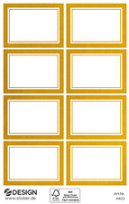 ProductinformatieRechthoekig, van papier, met wit beschrijfbaar veld,opdruk met reliëf in gouden kader, afneembaar, met de hand beschrijfbaar,inhoud: 3 vellen met elk 8 etiketten.