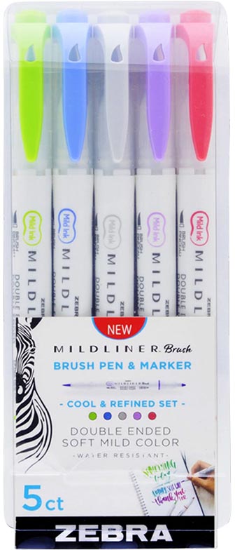 ZEBRA MILDLINER brushpen en fineliner, Cool and Refined , etui van 5 stuks, in geassorteerde kleuren