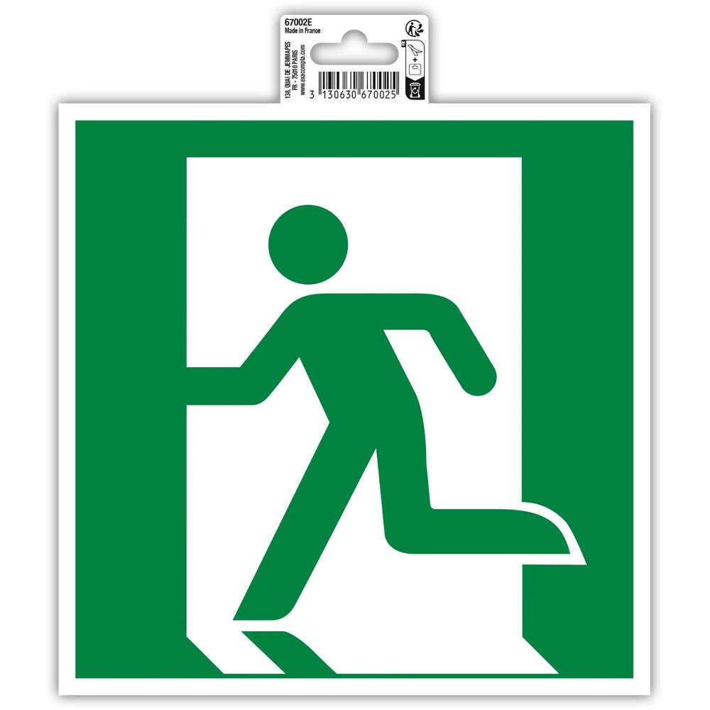 Borden met evacuatie- en nooduitgangen zijn verplicht in alle publiek toegankelijke ruimtes, en zijn nodig voor het beheer en de goede opvolging van het evacuatieplan, bijvoorbeeld in geval van brand. Om gemakkelijk herkenbaar te zijn, moeten deze borden op een zichtbare plaats worden aangebracht. Onze borden zijn conform de ISO 7010 standaard, en zijn uitermate nuttig in geval van nood. De dikte van onze borden maakt ze duurzaam. Ze zijn zelfklevend, en daardoor gemakkelijk te bevestigen op muren, deuren of elke andere ondergrond. Te combineren met de zelfklevende borden evacuatie rechts (ref. 67001E), nooduitgang (ref. 67003E of 67004E) en verzamelpunt (ref. 67005E).